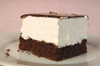 A cukrot a zsírral, a tojássárgákkal habosra keverjük, hozzáadjuk a kakóport és alaposan elkeverjük.Beledolgozzuk a lisztet , a sütőport és a tejet.Sütőpapírral bélelt formába öntjük, majd kb. 30 perc alatt. 180 fokon készre sütjük.Elkészítjük a habot: A tojásfehérjéket , a cukorral, gőz felett kemény habbá verjük. Ráöntjük a már megsült piskótára és elsimítjuk. 150 fokon kb. 10-15 percig szárítjuk. (ha barnul a teteje, akkor már jó ) Ha kihült, csokimázzal leöntjük.