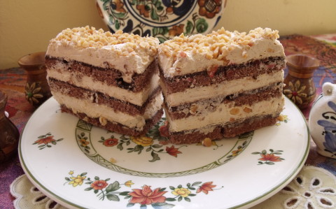 A sütemény tetejét kenjük meg krémmel és végül szórjuk meg apróra vágott földimogyoróval.